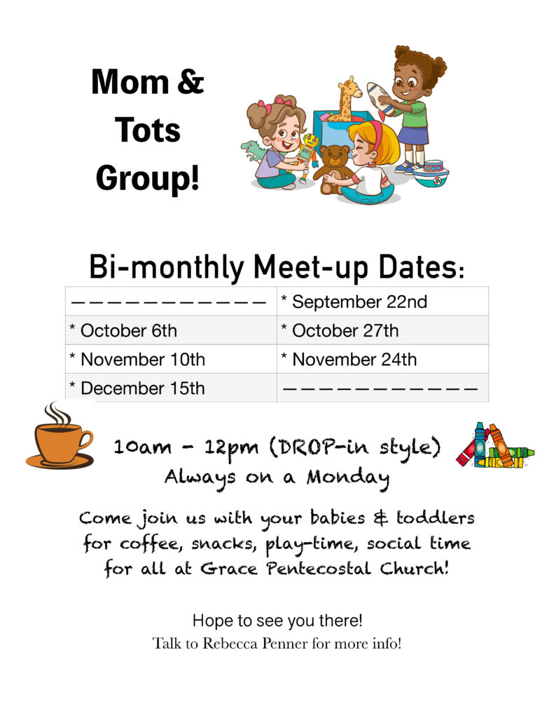 Moms & Tots Group meets bi-monthly on Mondays from 10:00am - 12:00pm starting September 22nd.